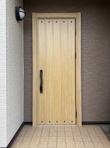 すっきりしたデザインの木目調ドアです。ナチュラルな色で玄関まわりが明るくなりました。 断熱、防犯性も高く、スマートコントロールキーで簡単に鍵の開け閉めができるのもポイントです。 また、スマートフォンに専用アプリをダウンロードすればスマホでも鍵の開け閉めが可能になります。